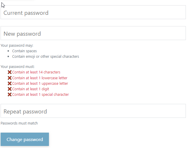 Enter a new password in the New password field. Your new password must contain at least 14 characters, 1 lowercase letter, 1 uppercase letter, 1 digit, and 1 special character.